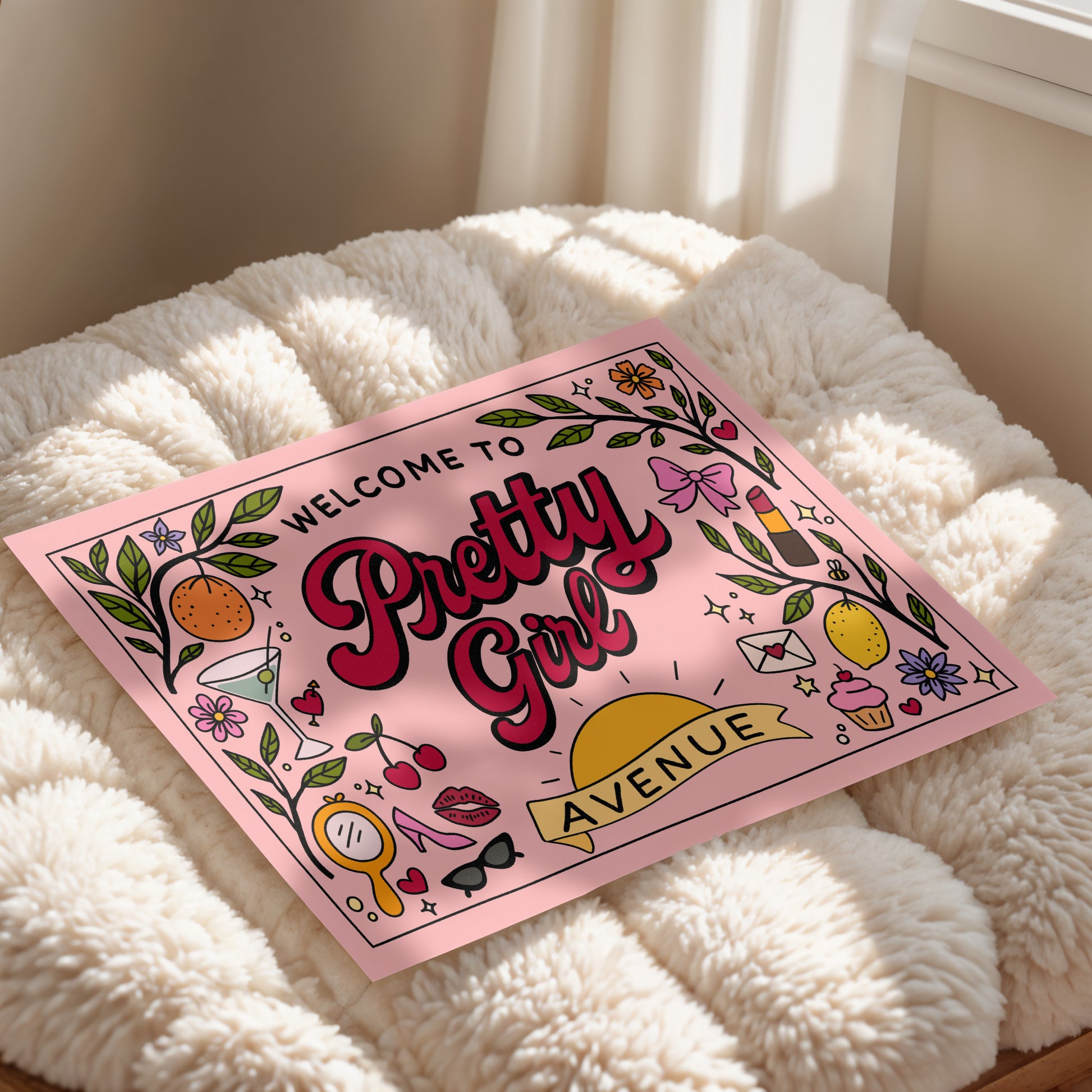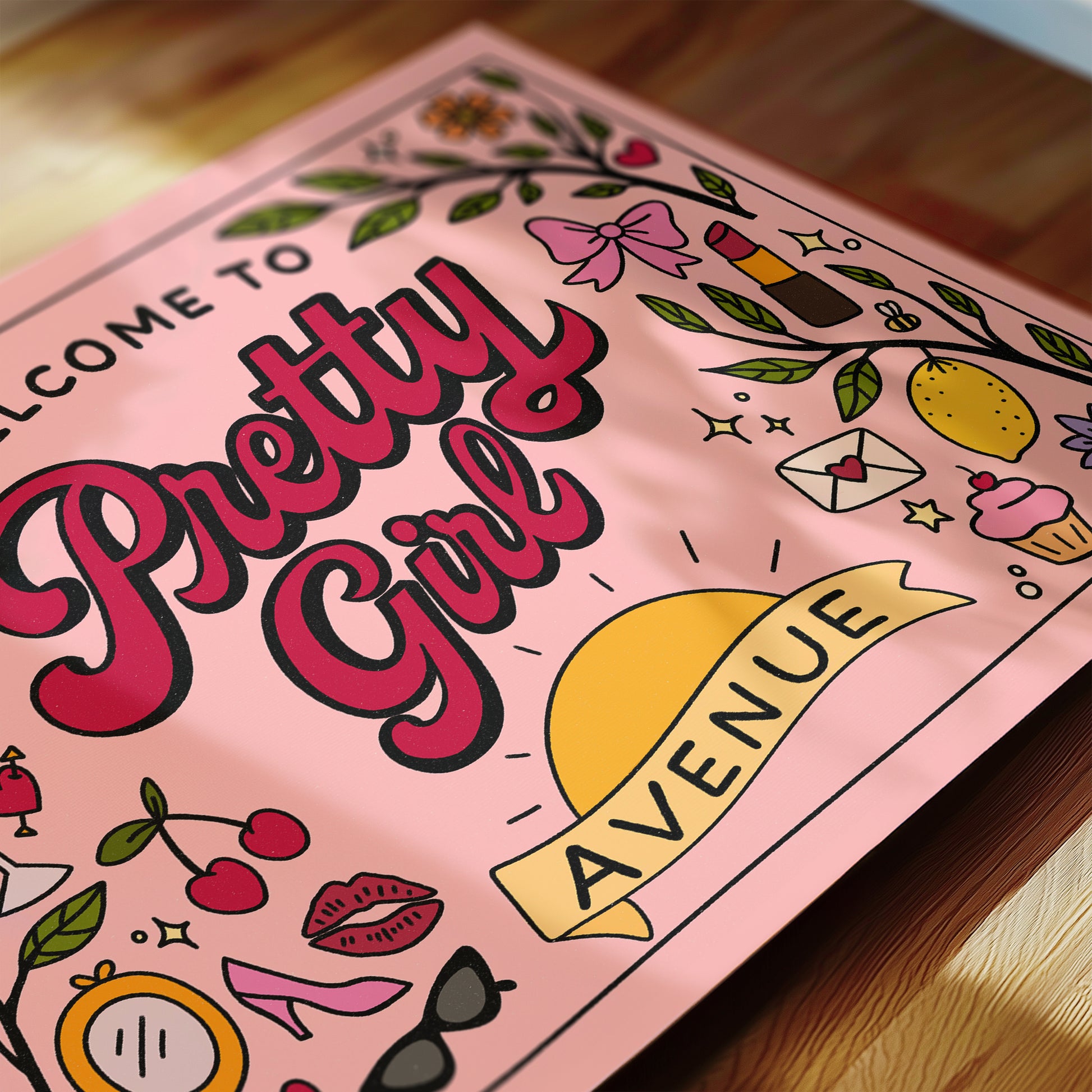 Step into Pretty Girl Avenue with this bold retro wall art print. Designed in playful shades of pink with fun girly doodles — from cherries and lipstick to sunshine and flowers — this poster is the perfect statement piece for bedrooms, dorms, or creative studios.